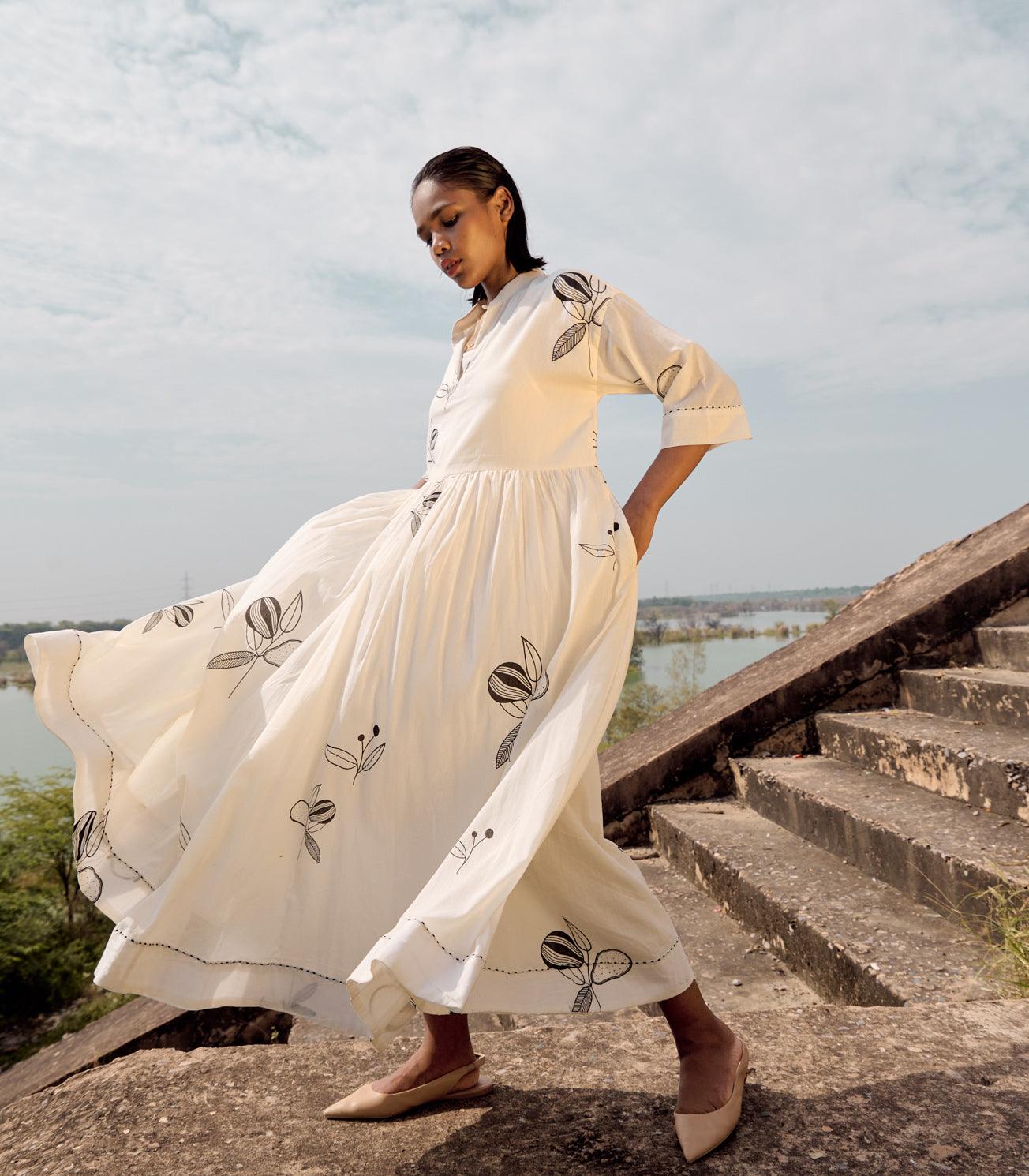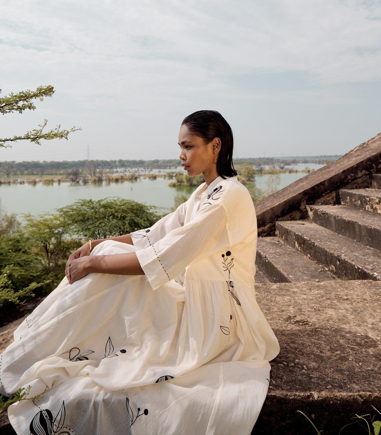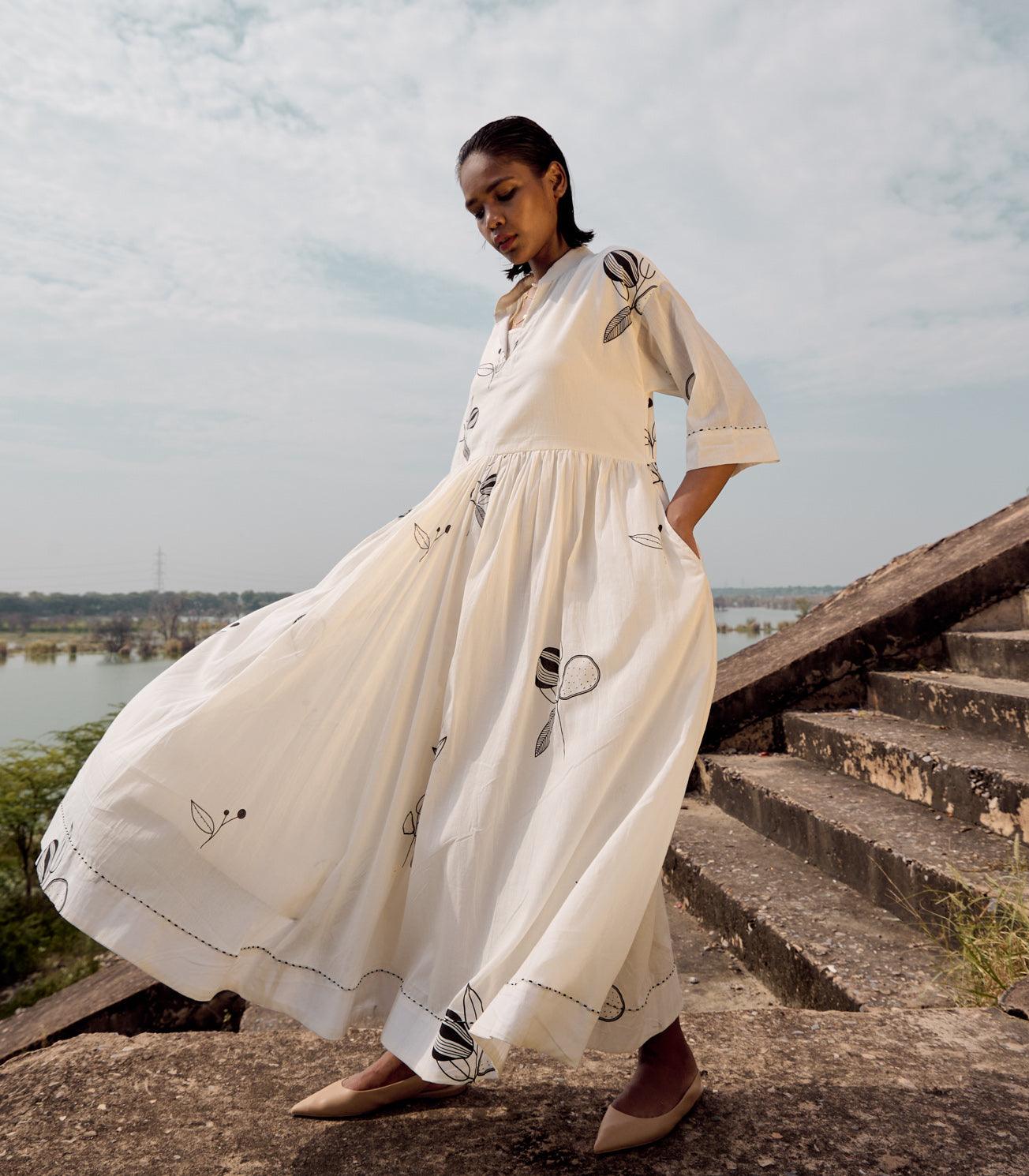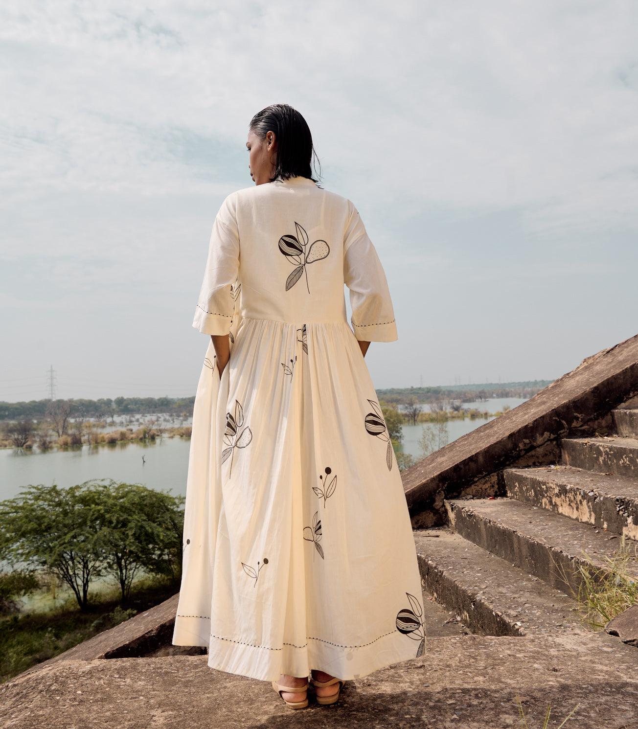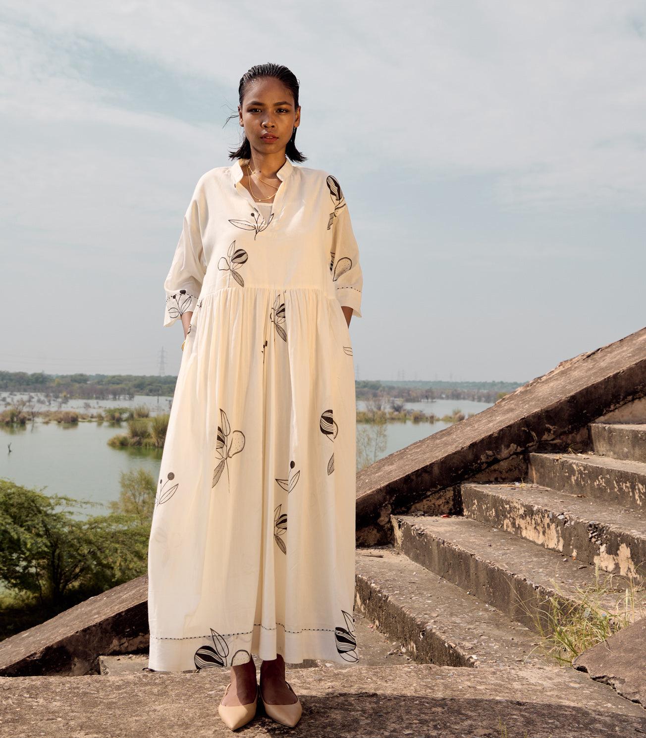 An off white mul dress with mandarin collars, front button opening, gathers around the wasitline and hand running stitches along the hem of the dress and the sleeves.