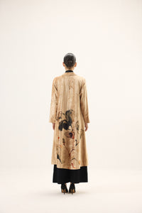Crafted in rich golden velvet, this trench coat is a statement of quiet opulence. The fabric’s natural sheen lends a luminous depth, while bold abstract florals across the surface, create a striking visual contrast. Designed with long sleeves and a fluid silhouette, it layers effortlessly, balancing artistic expression with timeless elegance for a truly elevated outerwear piece. Lining: Red Checkered Mul Lining