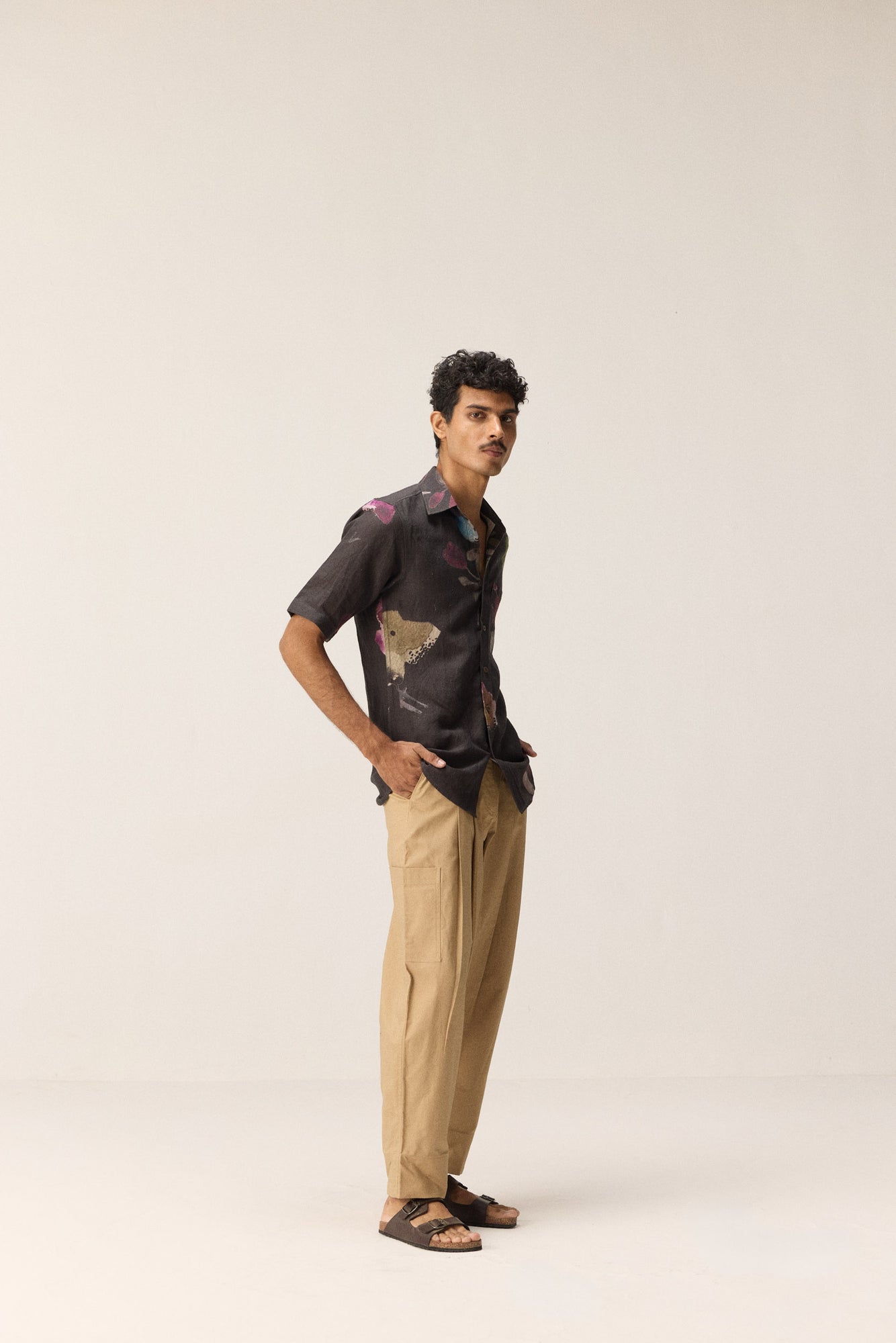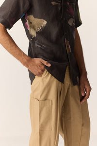 A belgian linen shirt for men in a deep charcoal grey, elevated with subtle hand painted floral motifs. Lightweight yet refined, it’s an effortless choice for evening outings—where comfort meets quiet elegance.