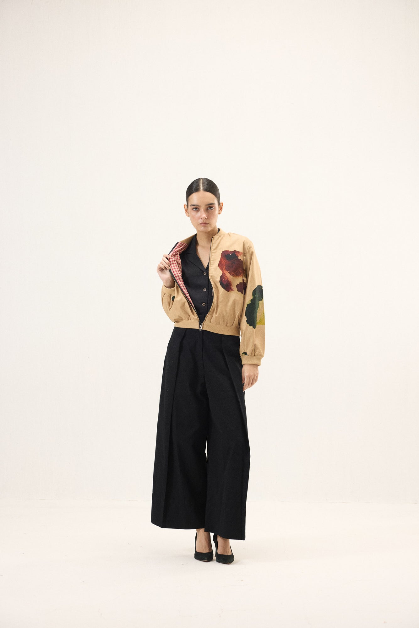 A refined take on contemporary outerwear, this tan bomber jacket is crafted to make a statement. The bold floral prints across the silhouette lend an artistic and expressive charm. Designed with a front zipper and two functional pockets, it offers ease and versatility.