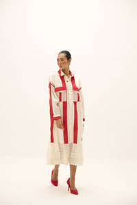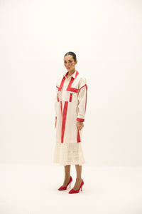 A contemporary shirt dress in handwoven cotton mul, defined by bold contrast panels in red and delicate lace detailing at the hem. Featuring utility-style flap pockets and a straight relaxed fit, it blends structure with femininity for a modern, effortless look.