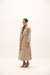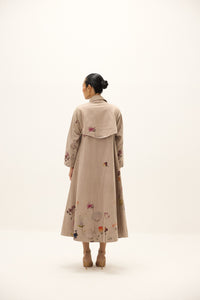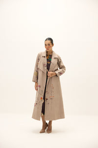Cut in soft corduroy, the Taupe Trench Coat brings together classic tailoring and artisanal detail. Its longline silhouette is finished with a wide notched lapel and relaxed shoulders, making it ideal for layering. Delicate floral motifs, rendered in painterly strokes across the front, sleeves, and back, add a subtle yet striking accent.