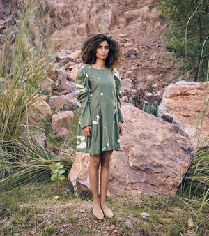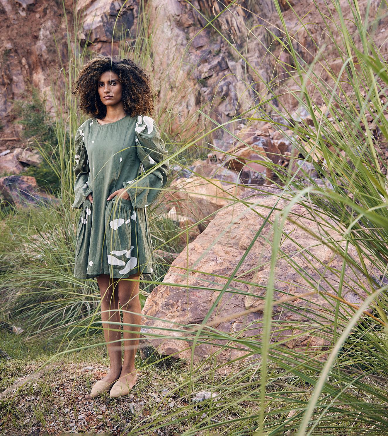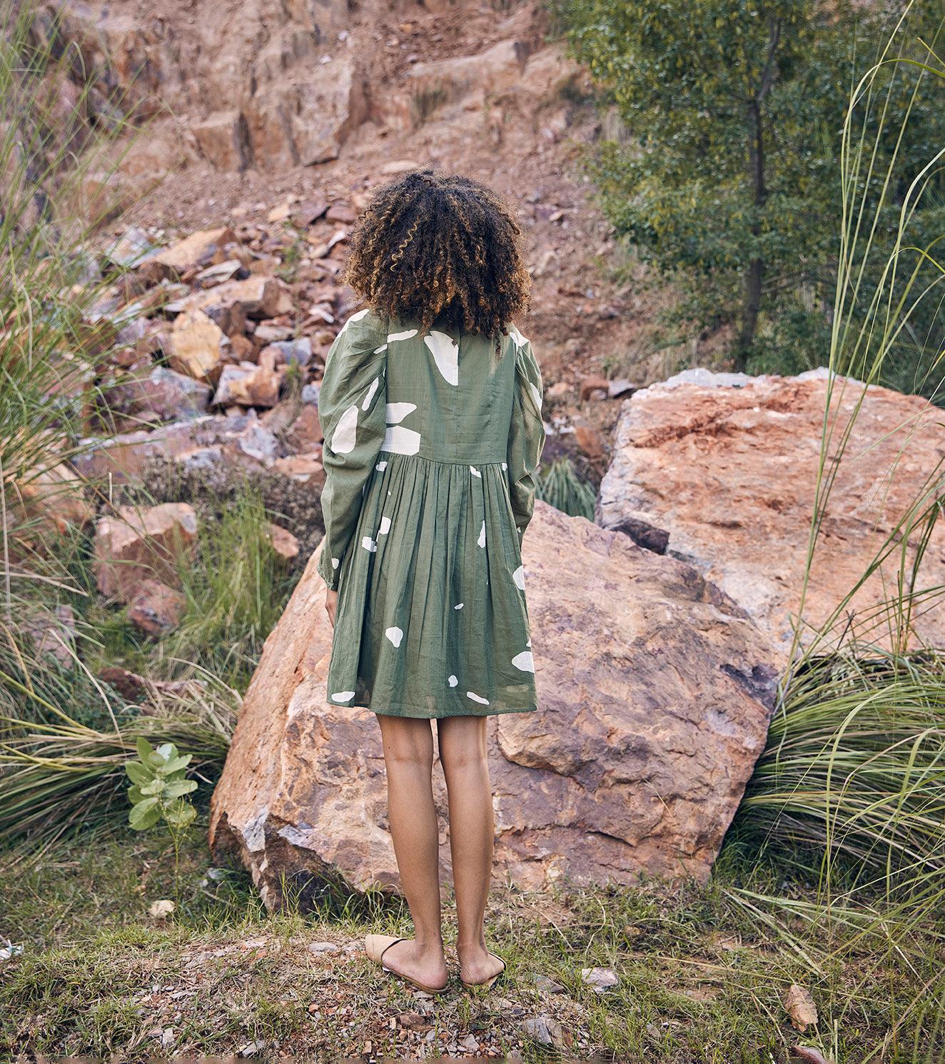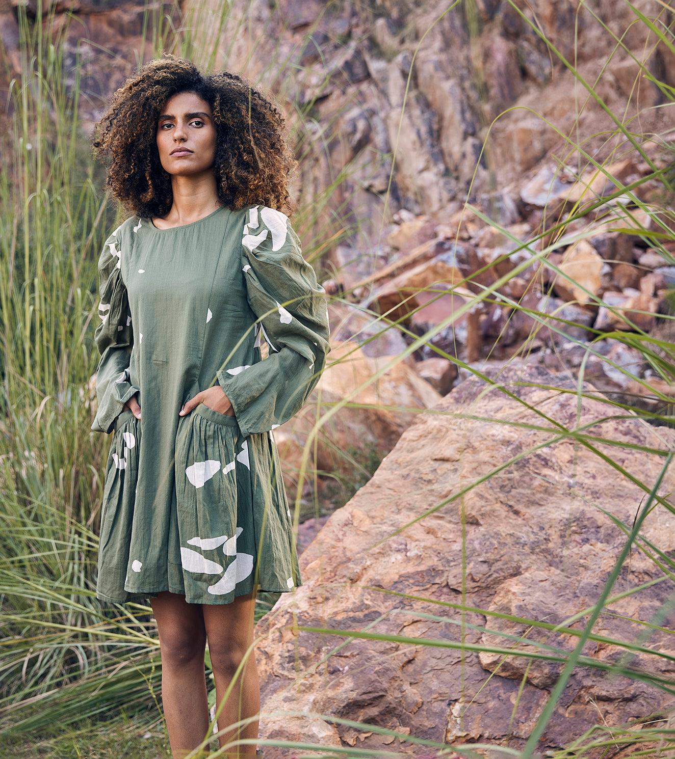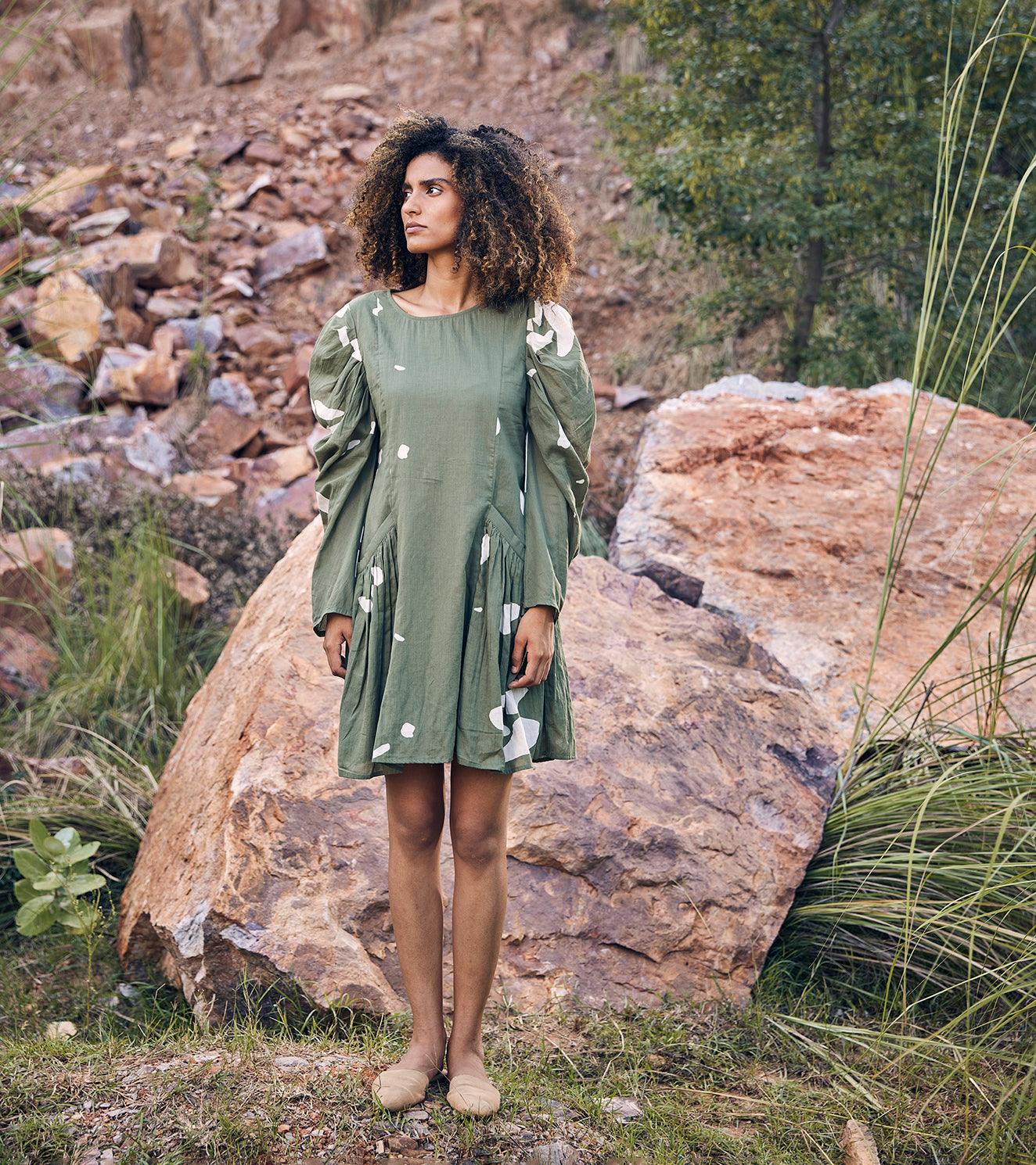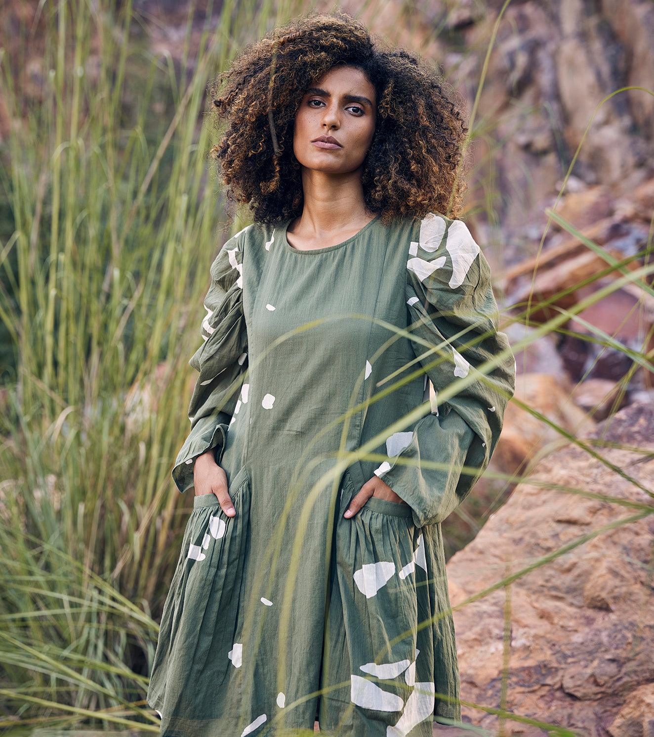 A mosiac print dress with puffy gathered sleeve, welt pocket and back.