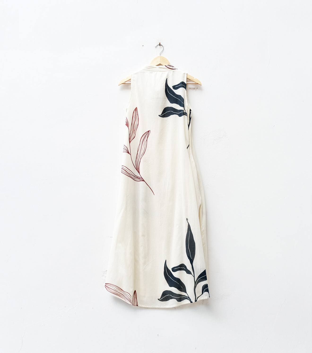 A breezy mul off-white sleeveless dress featuring a delicate fine-line floral print on the bodice. Light, soft, and effortlessly elegant — perfect for easy everyday styling.